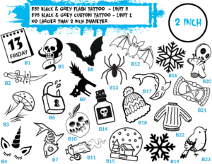 We will have specials on select flash tattoos, custom tattoos (restrictions apply), and a variety of piercings. This is a one-day event, first come first serve, and we will not be taking any appointments or offering rainchecks. The doors will open at 8 am, this is a high traffic event, please expect there to be a wait throughout the day into the night. In the past, clients have started to line up an hour or so prior.